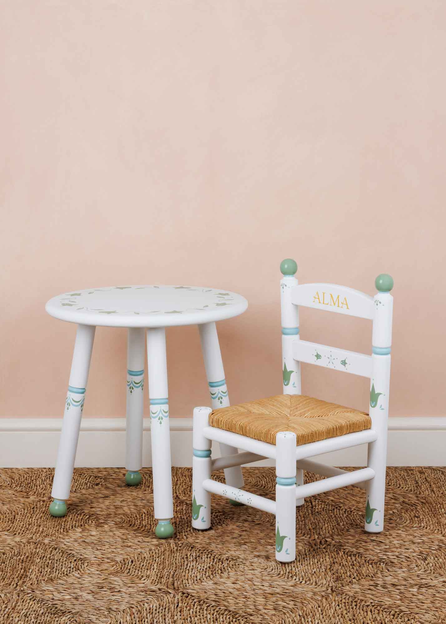 Our tables are handmade in our studio in Sussex, England, and our chairs are sustainably handmade in Portugal using solid beech with a woven rush seat. Each set is then hand-painted in our studio using water-based non-toxic paints.