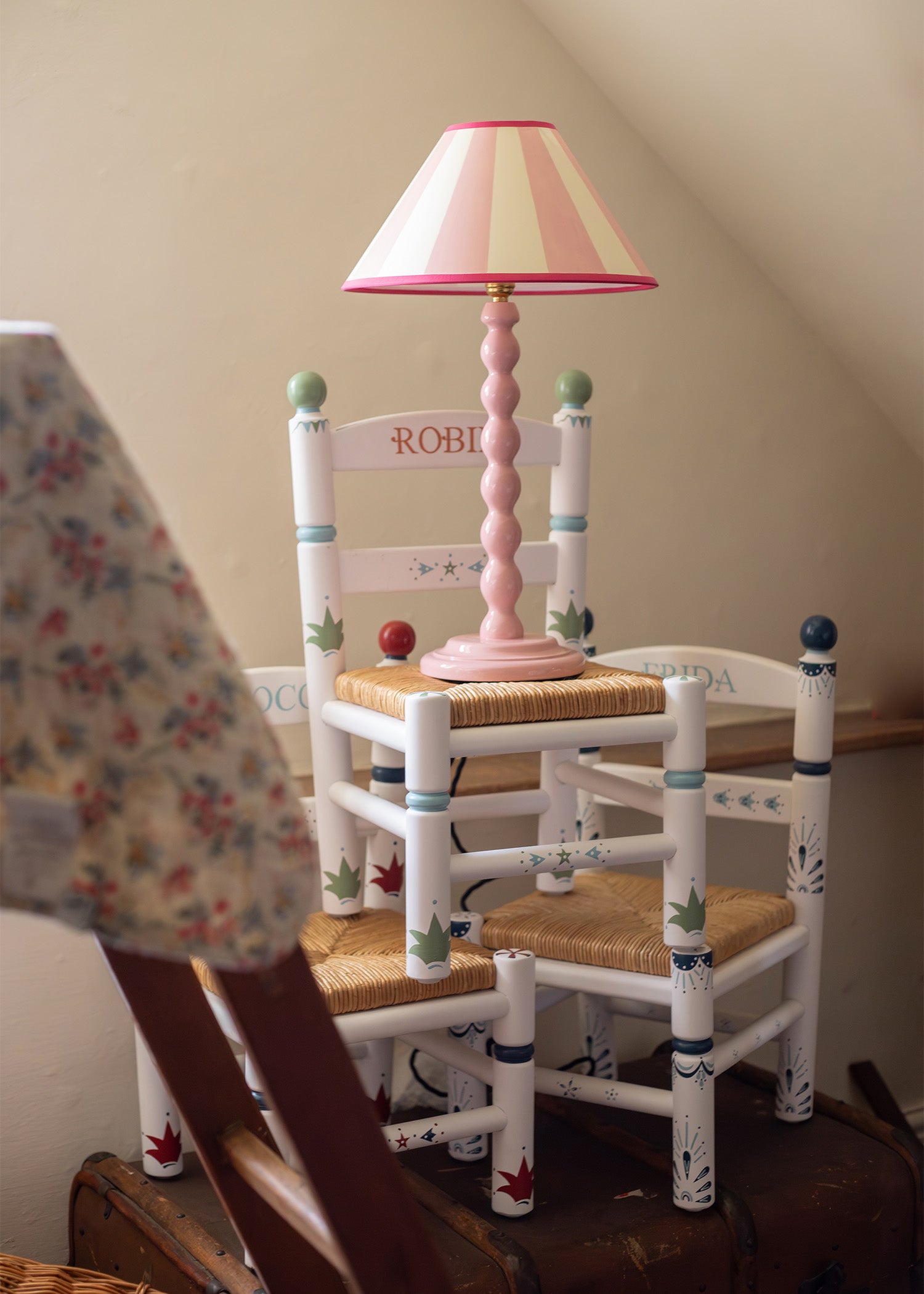 Our chairs are sustainably handmade in Portugal using solid beech with a woven rush seat. Each chair is then handpainted in our studio in Sussex, England, using water-based non-toxic paints.