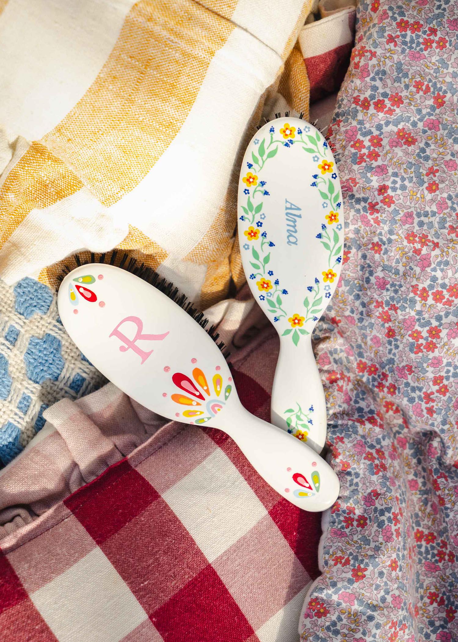 Our hairbrushes are handpainted by our team of artists in Sussex, England, using hard wearing enamel paints. The Mason Pearson hairbrushes are handcrafted from a premium blend of nylon tufts and boar bristles. There is a gold Mason Pearson logo on the underside of the handle.